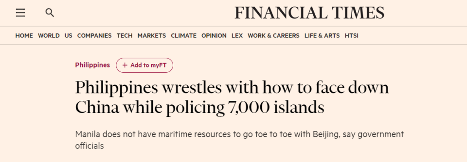 这几天,菲律宾又开始"卖惨"了。在接受英国《金融时报》采访时,菲律宾国家安全委员会发言人马拉亚一改往日强硬姿态,突然放低姿态表示,"菲律宾没有能力跟中国针锋相对,我们不是像中国这样拥有大量资源的正在崛起的超级大国,所以我们必须接受现状,与之共存。"